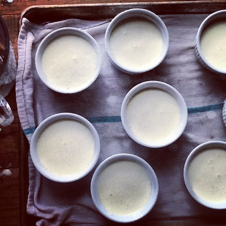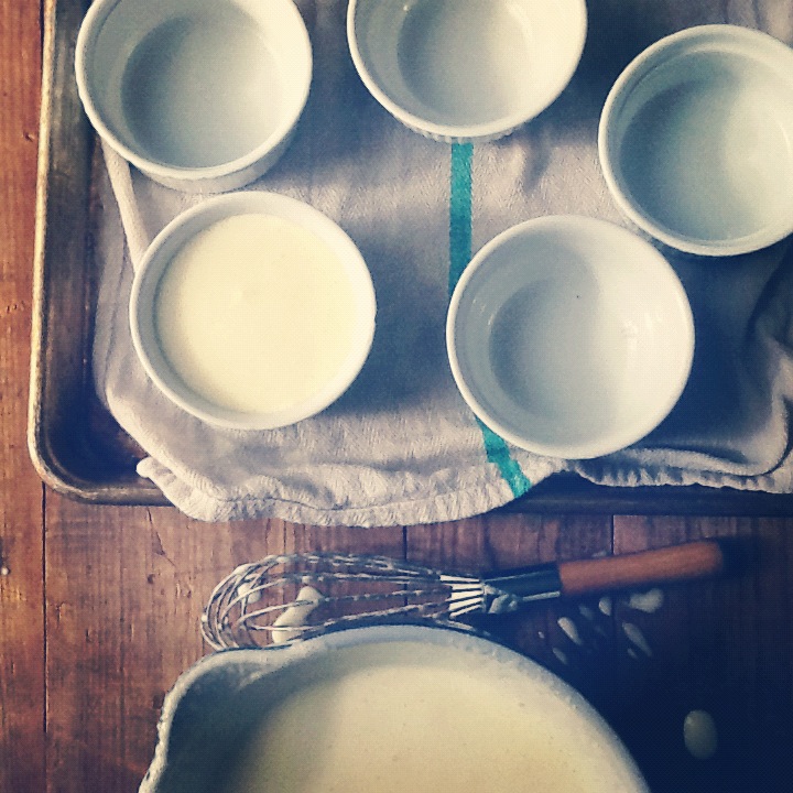 NOTE: to secure the ramequins/custard cups on the sheet pan, wet a dish towel and lay in the sheet pan, making sure none of the fabric hangs over the pan. Place the containers on the towel and once the mixture is in the ramequins, slowly pour hot water in the sheet pan bringing the water level half way to the ramequins. This towel “trick” can be used each time you have to bake small items in a water bath and you don’t want them moving around in the container and spilling their contents.